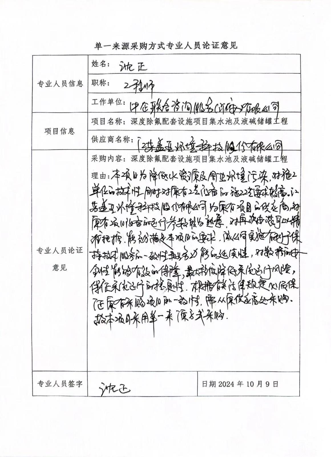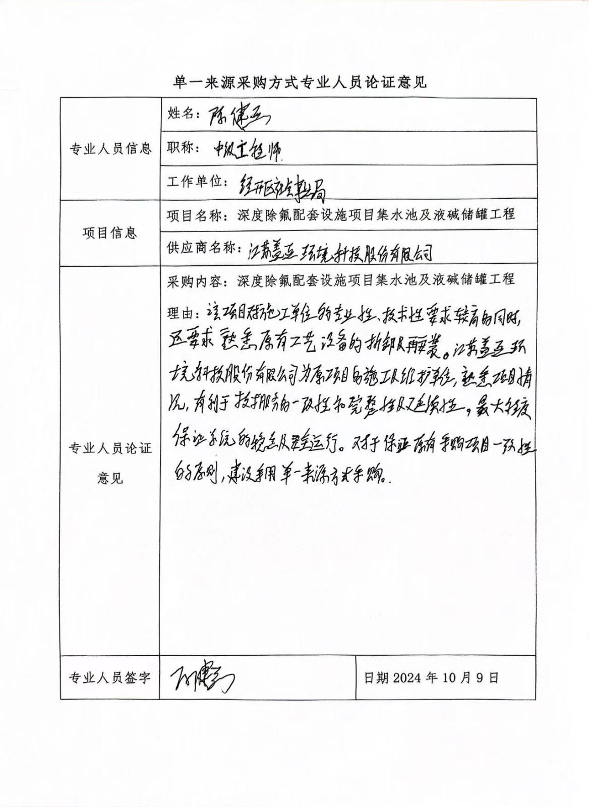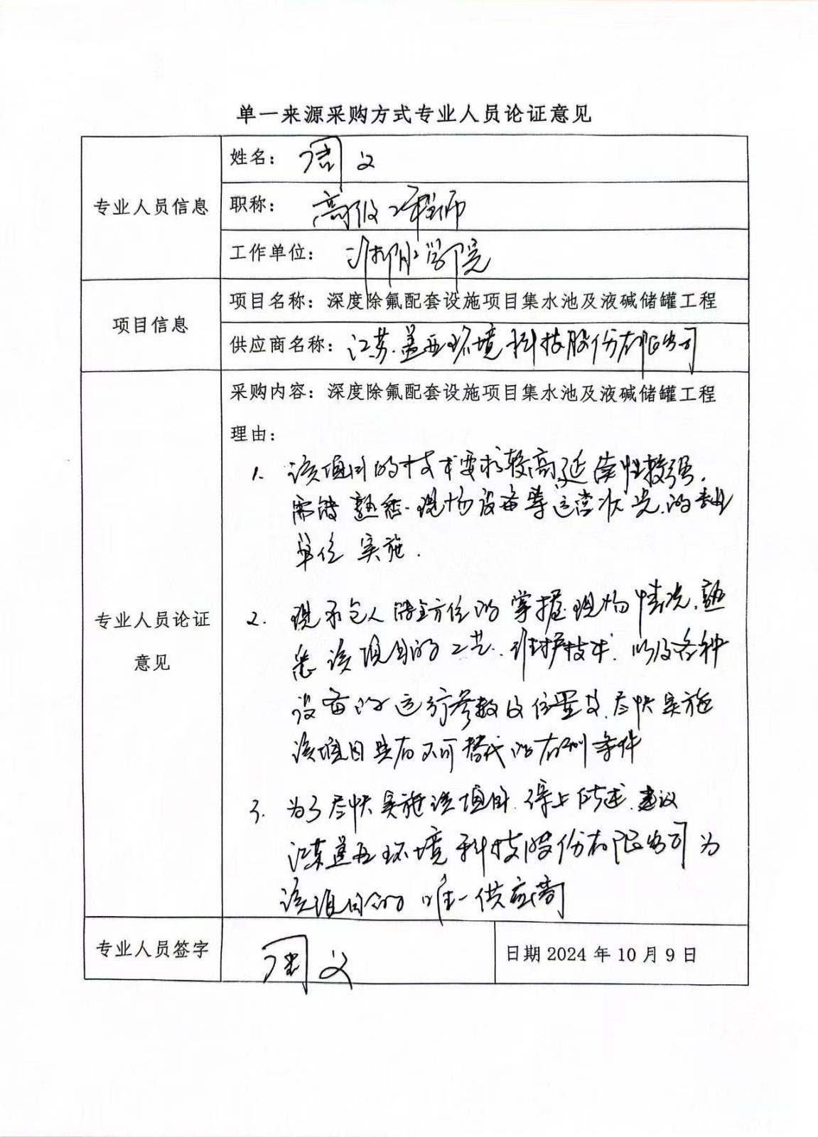 一、項(xiàng)目信息 采 購(gòu) 人:淮安港淮建設(shè)發(fā)展有限公司 項(xiàng)目名稱:深度除氟配套設(shè)施項(xiàng)目集水池及液堿儲(chǔ)罐工程 擬采購(gòu)的貨物或服務(wù)的說明:深度除氟配套設(shè)施項(xiàng)目集水池及液堿儲(chǔ)罐工程 擬采購(gòu)標(biāo)的預(yù)算金額:213萬元 采用單一來源采購(gòu)方式的原因及說明:本項(xiàng)目是深度除氟配套設(shè)施項(xiàng)目集水池及液堿儲(chǔ)罐工程,為深度除氟配套設(shè)施項(xiàng)目配套項(xiàng)目,建設(shè)深度除氟分別需要滿足原有的0.8萬m3/d、1.5萬m3/d、1.5萬m3/d、0.1萬m3/d設(shè)計(jì)要求,設(shè)計(jì)集水池需要完全配合原有的“混凝沉淀+樹脂吸附”處理工藝,并且要求經(jīng)處理后廢水氟化物濃度≤1.5mg/L,本項(xiàng)目為降低水資源及周邊環(huán)境污染,對(duì)施工單位的專業(yè)性、技術(shù)性同時(shí)對(duì)原有工藝設(shè)備的拆卸再安裝要求較高;江蘇蓋亞環(huán)境科技股份有限公司為該項(xiàng)目的總承包單位,對(duì)該項(xiàng)目有豐富的維護(hù)經(jīng)驗(yàn),熟悉原有設(shè)備的運(yùn)行參數(shù)及安裝位置條件,對(duì)再次安裝可以較為精準(zhǔn)把控,能滿足招標(biāo)人對(duì)工程質(zhì)量、服務(wù)響應(yīng)速度的要求。江蘇蓋亞環(huán)境科技股份有限公司施工有利于保持技術(shù)服務(wù)的一致性和業(yè)務(wù)功能的延續(xù)性,特別是在數(shù)據(jù)安全性可以得到最大程度的安全保障,可以最大程度降低系統(tǒng)運(yùn)行風(fēng)險(xiǎn),保證系統(tǒng)運(yùn)行效率和穩(wěn)定。故本項(xiàng)目由江蘇蓋亞環(huán)境科技股份有限公司負(fù)責(zé)實(shí)施,具有唯一性和不可替代性。 根據(jù)法律法規(guī)規(guī)定,使用不可替代的專利,專有技術(shù),或者公共服務(wù)項(xiàng)目具有特殊要求,導(dǎo)致只能從某一特定供應(yīng)商處采購(gòu)。故本項(xiàng)目采用單一來源方式采購(gòu)。 二、擬定供應(yīng)商信息 名稱:江蘇蓋亞環(huán)境科技股份有限公司 地址:蘇州工業(yè)園區(qū)唯正路8號(hào)唯亭科技創(chuàng)業(yè)大廈7樓701-724室 統(tǒng)一社會(huì)信用代碼:91320594050291184M 三、公示期限 2024年10月10日至2024年10月12日,任何投標(biāo)人、單位或個(gè)人對(duì)采用單一來源采購(gòu)方式公示有異議的,請(qǐng)于2024年10月12日17:30前以書面形式向招標(biāo)人反映。 四、專業(yè)人員對(duì)相關(guān)供應(yīng)商因?qū)@?、專有技術(shù)等原因具有唯一性的具體論證意見: 根據(jù)法律法規(guī)規(guī)定,該項(xiàng)目符合《中華人民共和國(guó)政府采購(gòu)法》第三十一條 第一、三款所述情況,“只能從唯一供應(yīng)商處采購(gòu)的”,“必須保證原有采購(gòu)項(xiàng)目一致性或者服務(wù)配套的要求,需要繼續(xù)從原供應(yīng)商處添購(gòu)。為有效保障深度除氟配套設(shè)施污水、污泥設(shè)備的穩(wěn)定運(yùn)行及無縫對(duì)接,故使用單一來源采購(gòu)方式。 五、聯(lián)系方式 1.招 標(biāo) 人:淮安港淮建設(shè)發(fā)展有限公司 聯(lián) 系 人:郭工 聯(lián)系地址:淮安經(jīng)濟(jì)技術(shù)開發(fā)區(qū)富譽(yù)路3號(hào) 聯(lián)系電話:13952343888 2.代理機(jī)構(gòu) 名 稱:宏信天德工程顧問有限公司 聯(lián)系地址:淮安經(jīng)濟(jì)技術(shù)開發(fā)區(qū)宏恒勝路11號(hào) 聯(lián) 系 人:沈靖 聯(lián)系電話:18762085577 六、附件 專業(yè)人員論證意見(見附件) 采 購(gòu) 人:淮安港淮建設(shè)發(fā)展有限公司 日 期:2024年10月10日