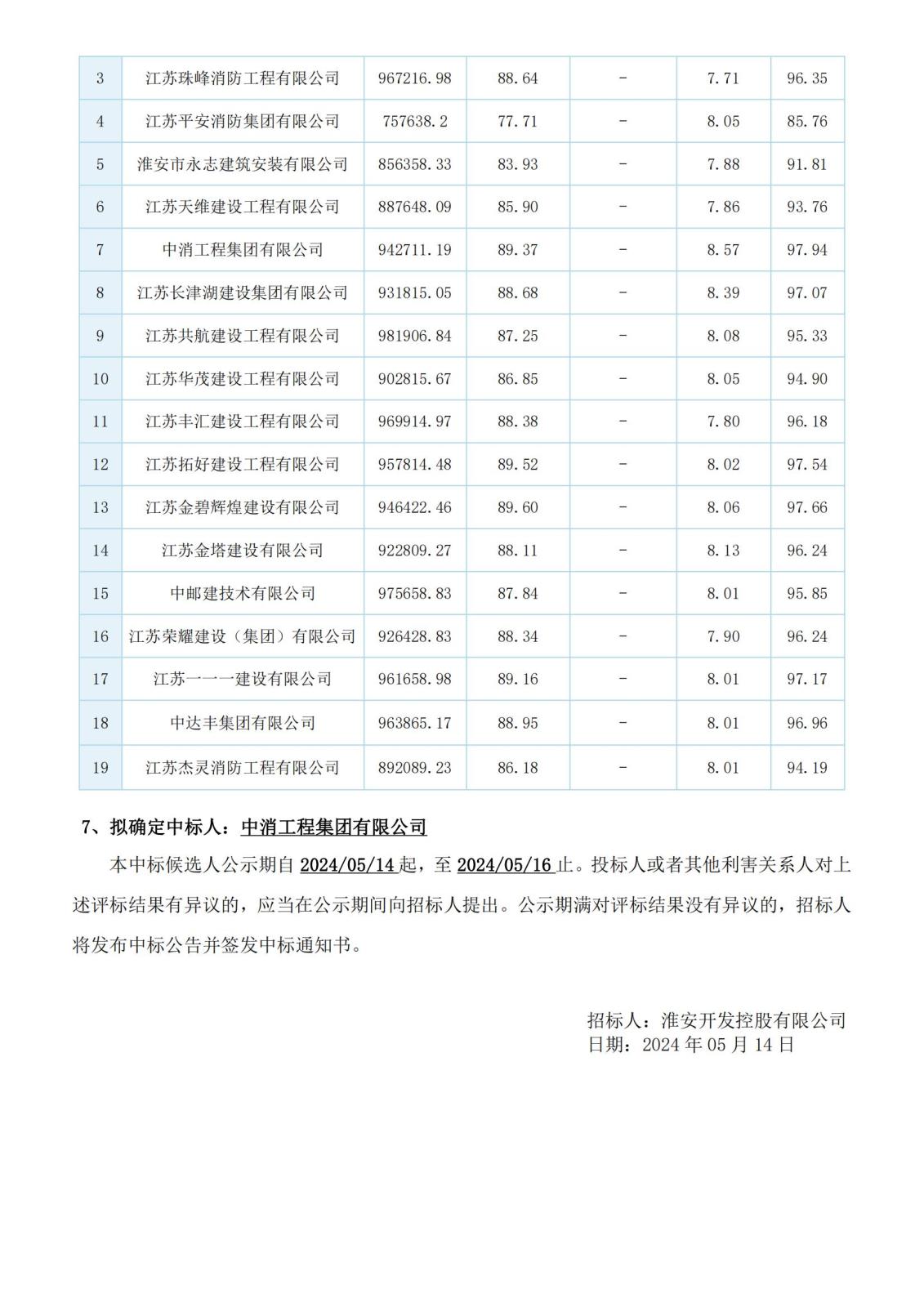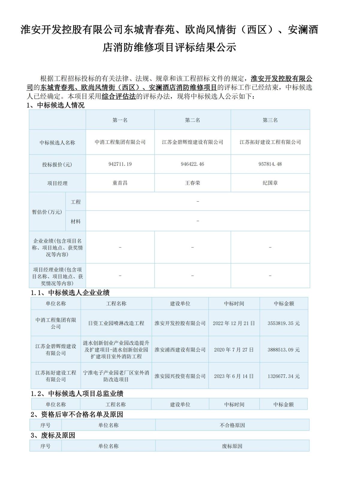 淮安開發(fā)控股有限公司東城青春苑、歐尚風(fēng)情街(西區(qū))、安瀾酒店消防維修項(xiàng)目評標(biāo)結(jié)果公示